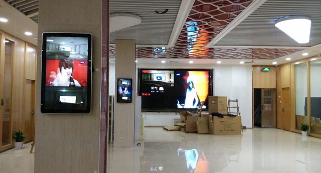 該工程使用的是3.5拼縫55寸低亮3x3的55寸液晶拼接屏和8臺(tái)32寸網(wǎng)絡(luò)廣告機(jī)。采用墻體凹槽鋁條掛墻活動(dòng)支架安裝方式,美觀平整,屏與墻合成一體。其它配套設(shè)備:一進(jìn)16出HDMI分配器和一個(gè)網(wǎng)絡(luò)播放盒。