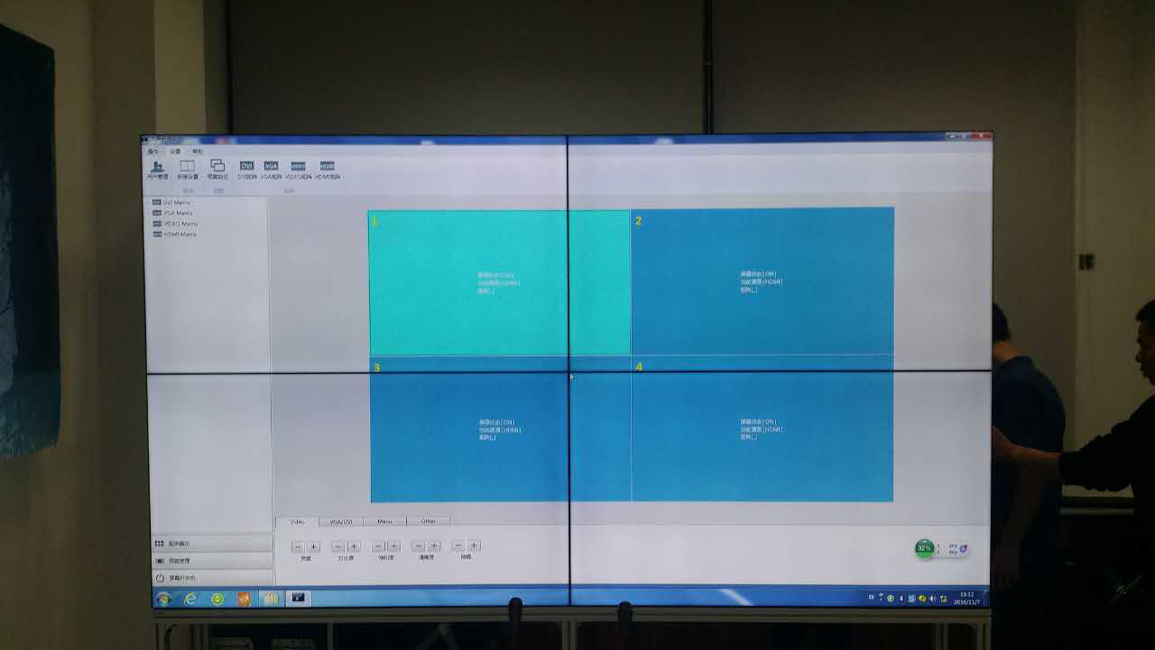 深圳某辦事處采用了雅迅達(dá)2×2拼接的55寸液晶拼接屏,同時(shí)使用了雅迅達(dá)定制的數(shù)字矩陣,并搭配了多屏處理器高清顯示設(shè)備。矩陣使用網(wǎng)絡(luò)控制,大屏也是網(wǎng)絡(luò)控制,可以實(shí)現(xiàn)多畫面同時(shí)顯示,并且可以實(shí)現(xiàn)自由開窗,監(jiān)視窗的窗口大小可以自由調(diào)控、位置可以隨時(shí)挪動(dòng),可以隨時(shí)切換信號源。是一種非常靈活的顯示方案,對于多監(jiān)控、多功能的液晶拼接屏顯示系統(tǒng),這個(gè)使用非常合理。