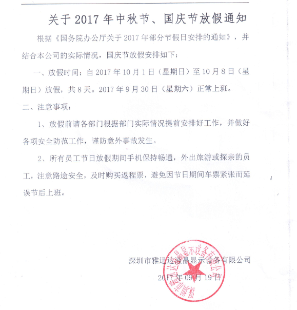 雅迅達(dá)放假通知,另祝大家國慶中秋雙節(jié)快樂!