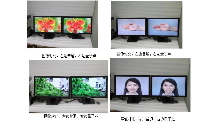 表測量 RGB 值。其他設置如下:對比度設置為 50;色溫設置在標準色溫模式;然后我們再準備一臺 不是量子點背光源的顯示器接上同樣的信號源,設置一樣。下面是現(xiàn)場測試照片對比
