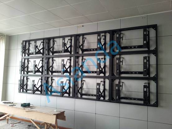 整個(gè)網(wǎng)絡(luò)視頻監(jiān)控系統(tǒng)由前端設(shè)備、中國電信全球眼平臺(tái)、監(jiān)控調(diào)度指揮中心、公司場(chǎng)站客戶端組成,能夠?qū)崟r(shí)把各個(gè)場(chǎng)站的監(jiān)控視頻數(shù)據(jù)通過網(wǎng)絡(luò)傳送至公司調(diào)度中心,作為在安防系統(tǒng)中重要環(huán)節(jié)之一的后端顯示,關(guān)系者整個(gè)系統(tǒng)功能的最終實(shí)現(xiàn),所以在選擇其產(chǎn)品時(shí)成為了中燃負(fù)責(zé)人最頭痛的問題,最終經(jīng)過在眾多品牌中的對(duì)比中燃選擇了我司46寸超窄邊拼接屏,搭建了3*4拼接墻,從理論上來說該拼接墻應(yīng)該不存在技術(shù)太多的難題,但是由于中燃監(jiān)控中心空間的限制無法采用較為簡單的機(jī)柜型拼接幕墻,最后經(jīng)過我司結(jié)構(gòu)工程師,產(chǎn)品工程師等人員商討后選擇了前維護(hù)型液壓支架使空間得到了更好的視覺上的感受。