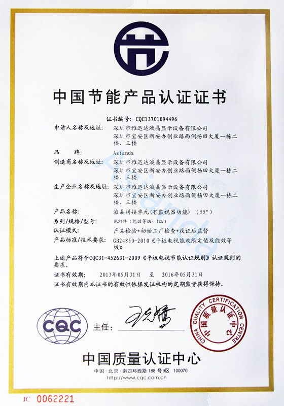 雅迅達(dá)55寸液晶拼接單元節(jié)能產(chǎn)品認(rèn)證證書(shū)見(jiàn)圖: