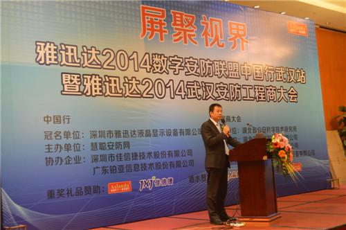 三月,正是江城櫻花盛開時(shí)節(jié)。3月24日,由深圳市雅迅達(dá)液晶顯示設(shè)備有限公司獨(dú)家冠名,慧聰安防網(wǎng)主辦,深圳市佳信捷技術(shù)股份有限公司、廣東鉑亞信息技術(shù)股份有限公司協(xié)辦,名品世家(北京)有限公司贊助的“屏聚視界——雅迅達(dá)2014數(shù)字安防聯(lián)盟中國(guó)行”,以及由深圳市雅迅達(dá)液晶顯示設(shè)備有限公司獨(dú)家冠名,湖北省公安科學(xué)技術(shù)研究院主辦,湖北萬澤展覽服務(wù)有限公司、北京四星展覽服務(wù)有限公司協(xié)辦的“2014武漢安防工程商大會(huì)”在武漢洪廣大酒店三樓宴會(huì)廳隆重舉行。