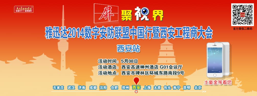 雅迅達(dá)中國(guó)行西安站今日開幕 經(jīng)過三天的緊張籌備,“屏聚視界——雅迅達(dá)2014數(shù)字安防聯(lián)盟中國(guó)行”西安站活動(dòng),今日在西安高速神州酒店如期舉行。