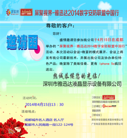雅迅達2014中國行4月戰(zhàn)開啟   剛剛結(jié)束的3月,雅迅達2014數(shù)字安防聯(lián)盟中國行圓滿完成了石家莊、武漢、濟南三站活動,打響雅迅達本年度最大型品牌活動首發(fā)戰(zhàn)役。在已經(jīng)到來的4月,雅迅達將延續(xù)3月的美好,繼...