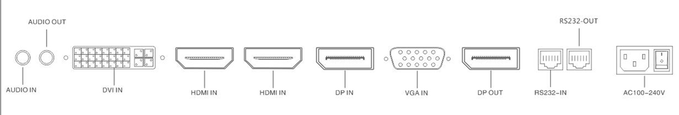HDMI 1.2/HDMI 2.0/DVI/VGA/ DP 1.2/AUDIO/RS232/IR |