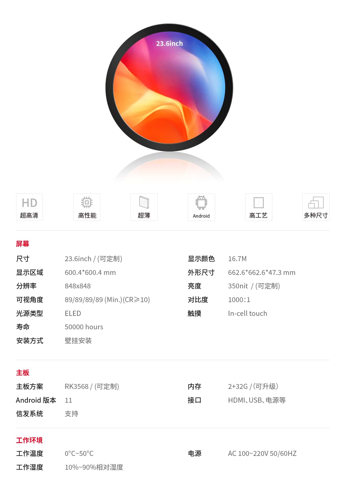 獨(dú)特圓形設(shè)計(jì):打破傳統(tǒng)矩形屏幕的局限,圓形顯示屏以其和諧的比例和優(yōu)雅的外觀,吸引目光,提升品牌形象。